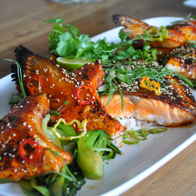 Place collars in cast iron pan skin side down, sprinkle generously with salt, and place in oven for approximately 20 minutes or until salmon is sticky, glazed and golden brown.