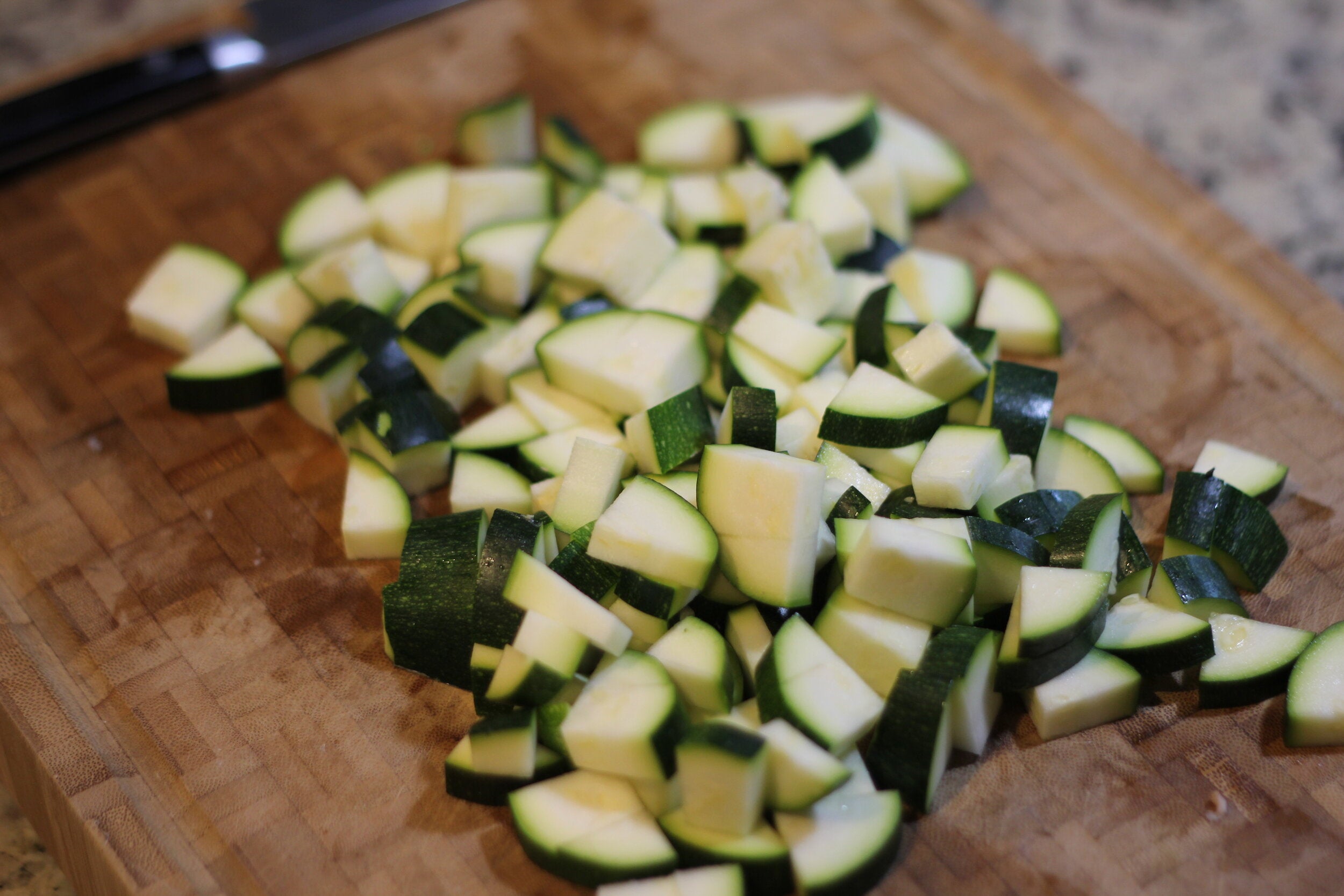 Remove onion and bacon from the pan, and reserve as much of the bacon and onion oil as possible. Once the oil in the pan is hot again, add the diced zucchini and cook until browned.