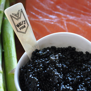 This handcrafted mother of pearl spoon is four inches long and perfect for elegantly serving caviar without interfering with the taste. Spoon handles have a Wulf's Fish logo.