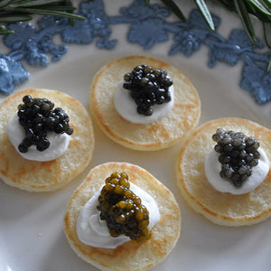 The classic caviar accompaniment, mini blinis add elegance to your caviar service. Top these little pancakes with crème fraîche, smoked fish, and your favorite caviars and roes.