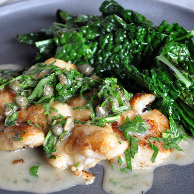 A classic piccata preparation with lemon, butter and capers reimagined here with delicate, succulent cod cheeks. Don’t fear cooking with cod cheeks! -